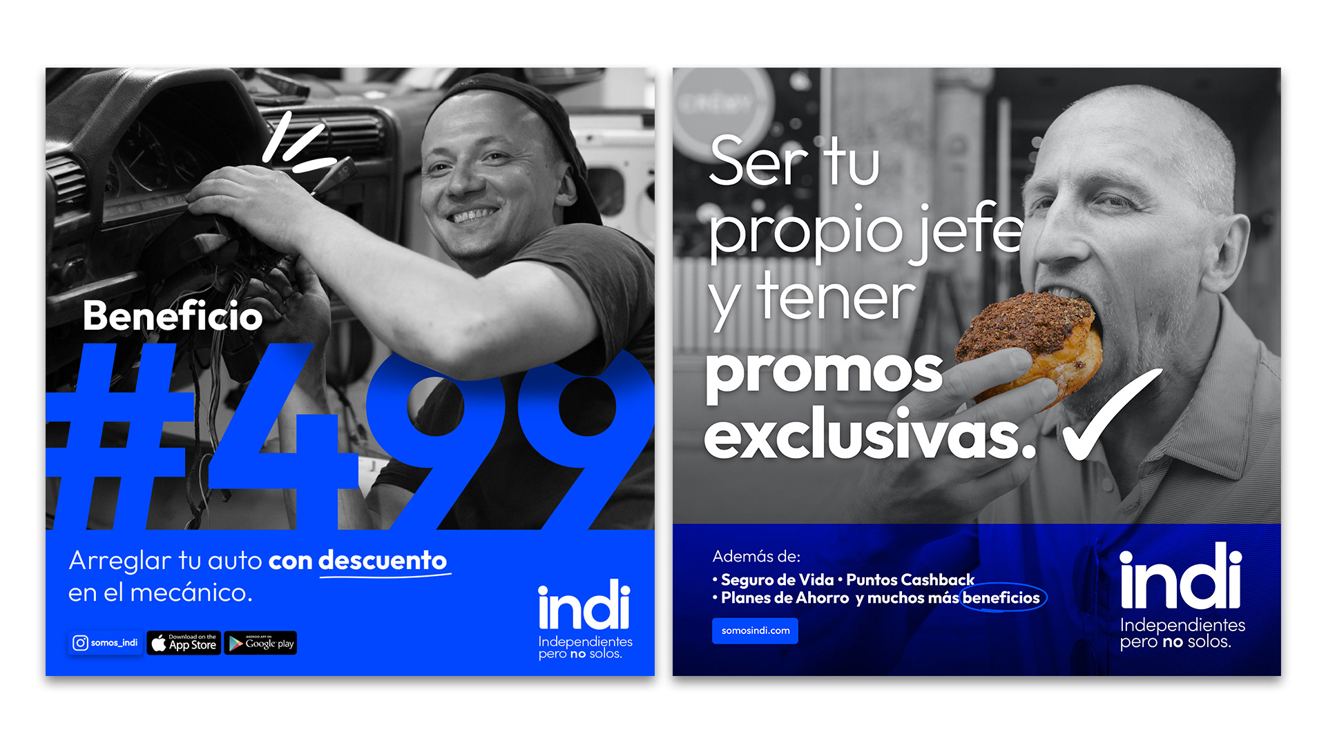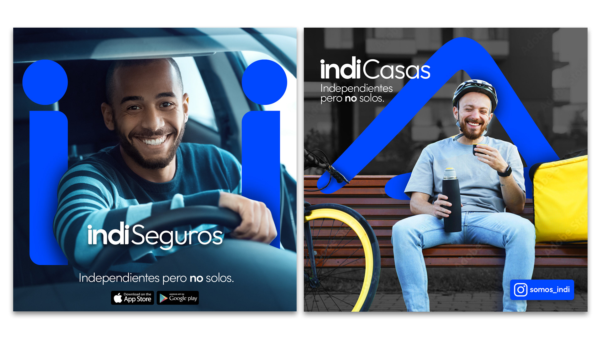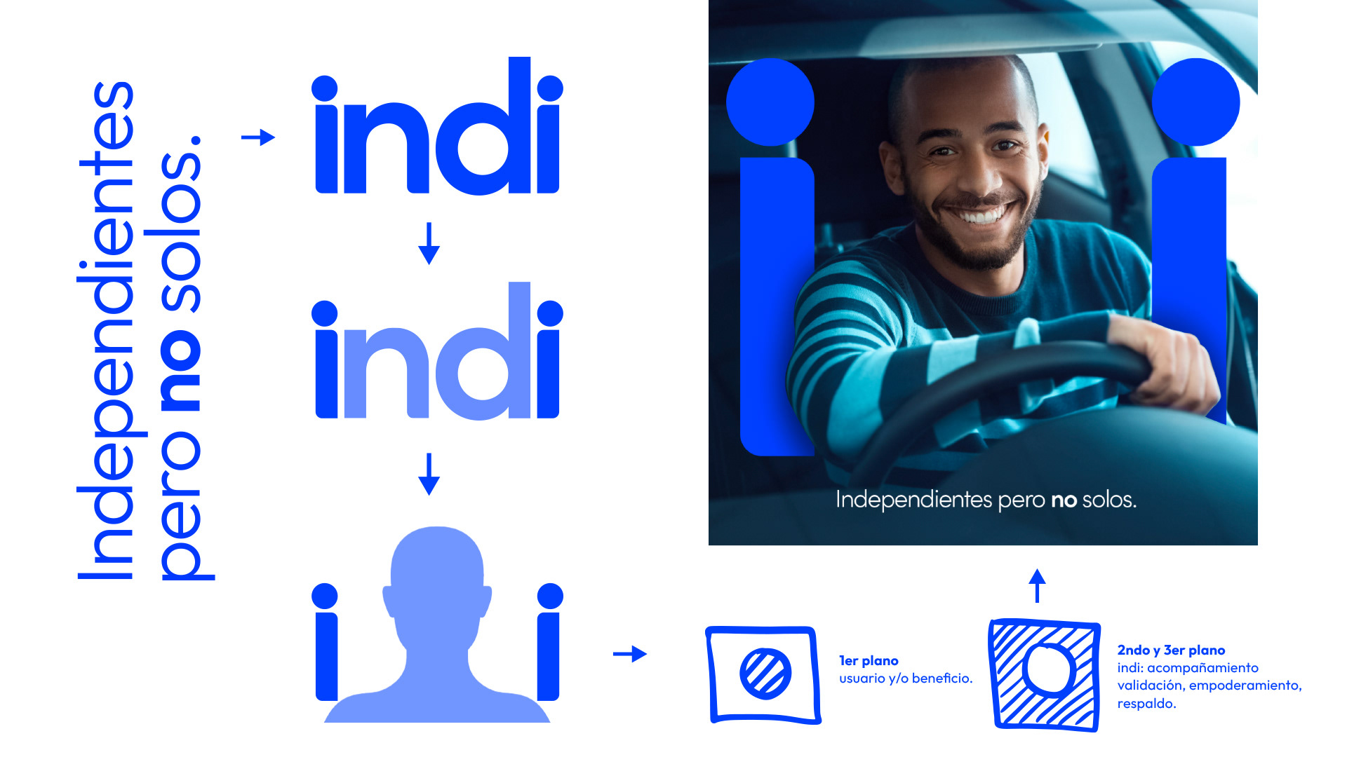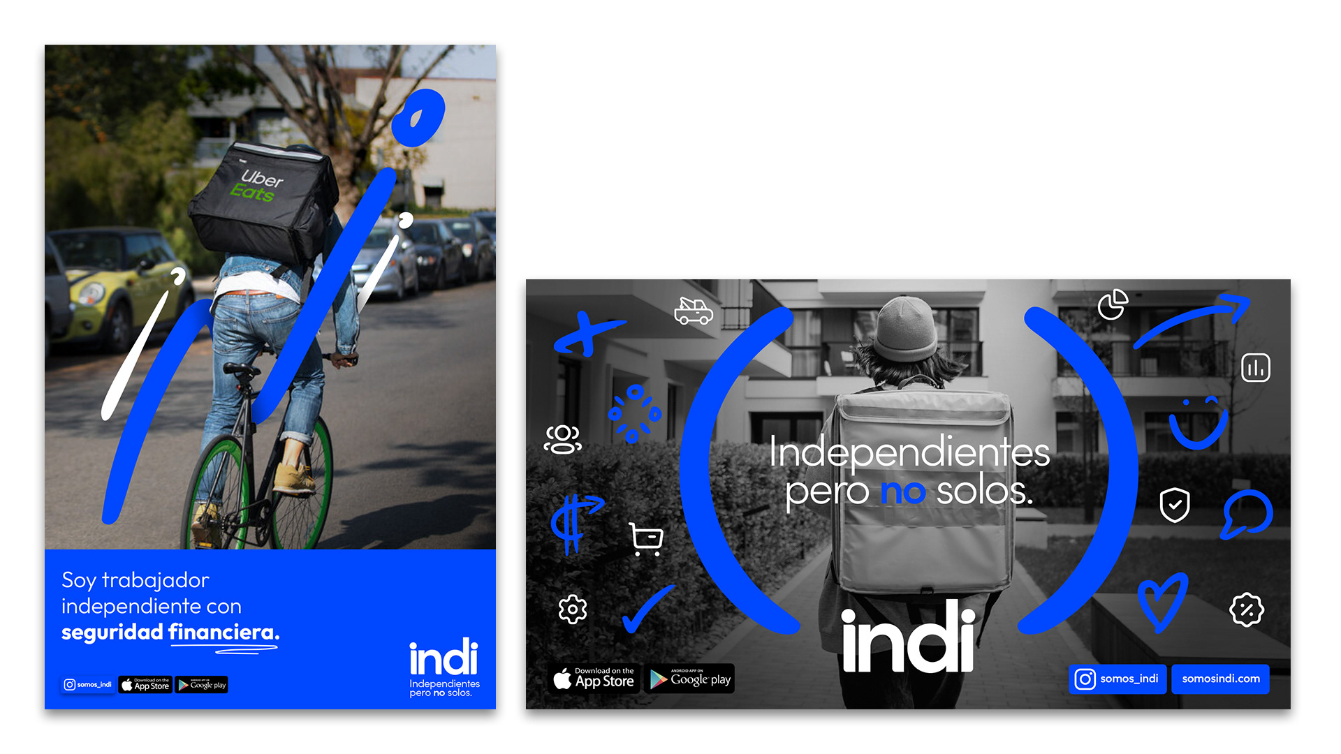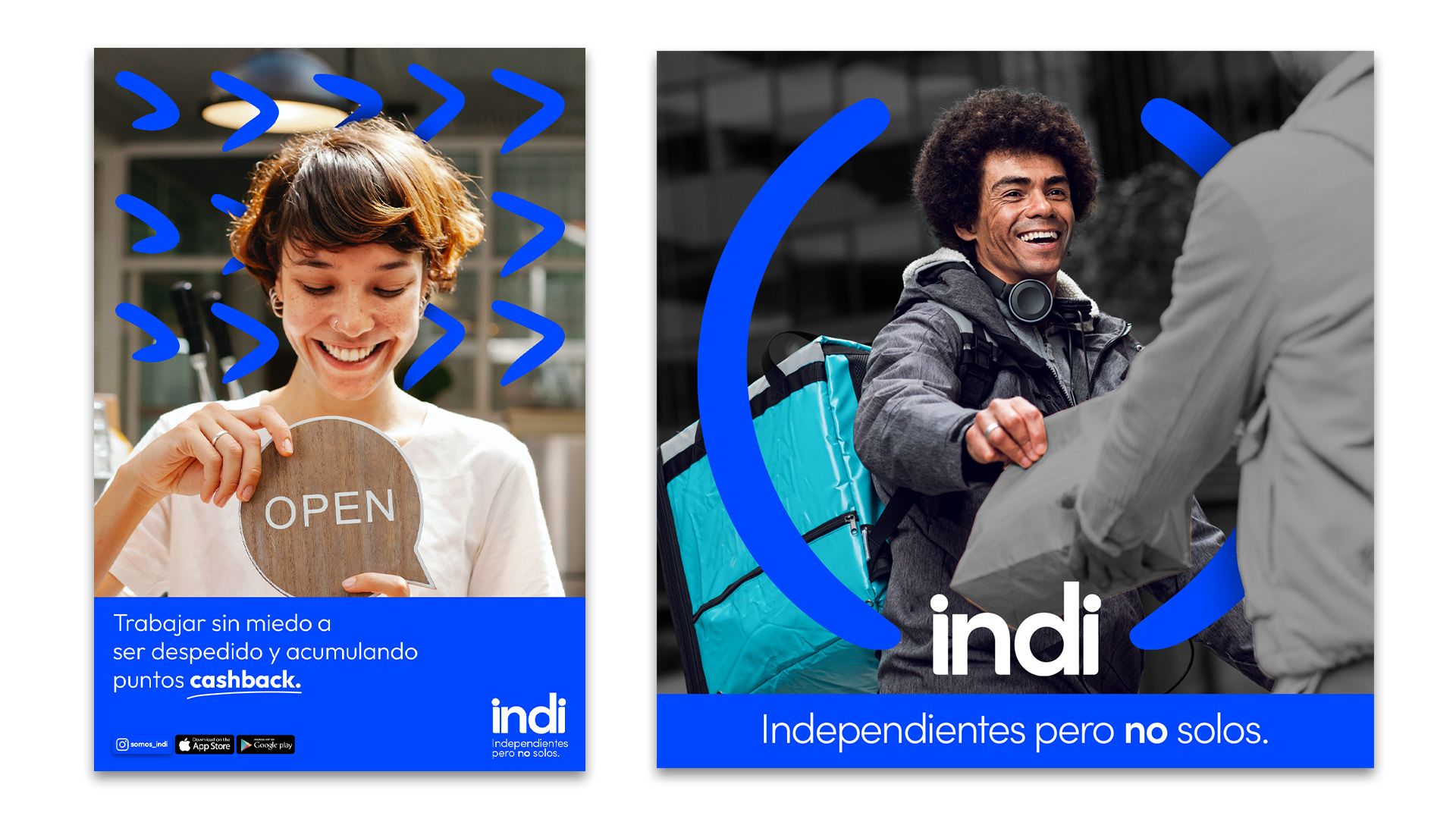 Brand design, conceptualization, graphic ingredients and communication idea for INDI, a benefits, logistics and financial support platform for independent workers.